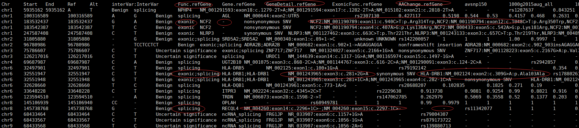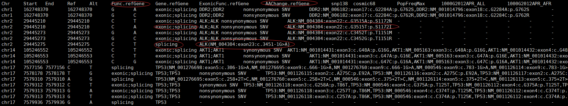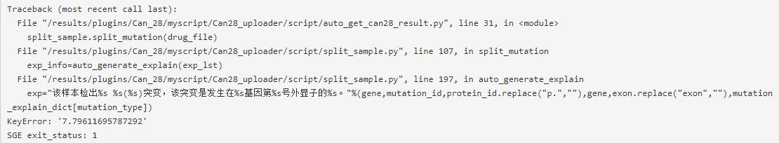 # 肺癌分析插件Can_28修复问题 ## 一、报错首先确定下网页上 (如http://172.24.3.5/report/271 ),barcode对应到的样品名是否拆分出数据,可能是tag用错了或者plan设错了。(一般我们设置好barcode系统后,没有变更过就没问题)  ## 二、插件总体思路 对bam文件生成mpileup格式,并分析mpileup结果,找出所有候选变异位点。之后应用1000人的阴性数据库进行变异检测。 ### 1、捕获区域为:/results/plugins/Can_28/design/CHP2.20131001.noh.bed,共28个区间,如下: ``` chr1 115256482 115256546 Can_NRAS_a . GENE_ID=NRAS chr1 115258721 115258811 Can_NRAS_b . GENE_ID=NRAS chr1 162748338 162748411 Can_DDR2 . GENE_ID=DDR2 chr3 178936051 178936111 Can_PIK3CA_a . GENE_ID=PIK3CA chr3 178952026 178952090 Can_PIK3CA_b . GENE_ID=PIK3CA chr7 55241645 55241725 Can_EGFR_18 . GENE_ID=EGFR chr7 55242445 55242510 Can_EGFR_19 . GENE_ID=EGFR chr7 55248988 55249083 Can_EGFR_20 . GENE_ID=EGFR chr7 55259485 55259549 Can_EGFR_21 . GENE_ID=EGFR chr7 140453083 140453165 Can_BRAF_15 . GENE_ID=BRAF chr7 140481395 140481473 Can_BRAF_11 . GENE_ID=BRAF chr10 89717623 89717710 Can_PTEN_a . GENE_ID=PTEN chr12 25380240 25380307 Can_KRAS_3 . GENE_ID=KRAS chr12 25398237 25398310 Can_KRAS_2 . GENE_ID=KRAS chr14 105246513 105246585 Can_AKT1_4 . GENE_ID=AKT1 chr17 37880971 37881058 Can_ERBB2_20 . GENE_ID=ERBB2 chr15 66727443 66727527 Can_MEK1_2 . GENE_ID=MEK1 chr17 7573984 7574075 Can_TP53_2 . GENE_ID=TP53 chr17 7576950 7577032 Can_TP53_3 . GENE_ID=TP53 chr17 7577082 7577173 Can_TP53_4 . GENE_ID=TP53 chr17 7577511 7577595 Can_TP53_5 . GENE_ID=TP53 chr17 7578144 7578226 Can_TP53_6 . GENE_ID=TP53 chr17 7578385 7578474 Can_TP53_7 . GENE_ID=TP53 chr17 7579290 7579381 Can_TP53_9 . GENE_ID=TP53 chr17 7579853 7579943 Can_TP53_10 . GENE_ID=TP53 chr2 29445209 29445298 Can_ALK_22 . GENE_ID=ALK chr2 29443574 29443664 Can_ALK_23 . GENE_ID=ALK chr2 29432659 29432741 Can_ALK_25 . GENE_ID=ALK ``` ### 2、流程跑完,结果目录过大,查看原因是中间的bam文件保留了两次。因此删除*.clean.bam和*tmap.bam,保留过滤比对排序后并用于call变异的*_rawlib.bam。 ### 3、Can_28插件修复问题如下,一直显示Started,查看log文件,最后的SGE状态为25。   查找原因:在目录/path/to/Can_28_out.553/BamStat/mpileup下有can28.sh、can28.log和filter.sh、filter.log,在filter.log文件中查看到如下报错: ``` > 报错1 Argument "1stVariationMAF" isn't numeric in numeric gt (>) at /results/plugins/Can_28/myscript/jwli/filter3.pl line 51, <IN> line 1. #报错2 Can't use an undefined value as an ARRAY reference at /results/plugins/Can_28/myscript/jwli/anno_mpileup.pl line 87, <IN> line 4. ``` 报错1在filter3.pl文件中,因为有表头,因此添加内容: `next if /^#Chromosome/; #add by lhlv 20180903` 报错2在anno_mpileup.pl,因此拷贝并修改该文件anno_mpileup2.pl,增加了结果输出文件Tag**-Tag**.3.anno2。 最后,在/results/plugins/Can_28/myscript/jwli/filtersh.py文件中调用相应的脚本,下面为修改后生成的filter.sh文件 ``` /results/plugins/Can_28/myscript/jwli/filter3.pl /results/analysis/output/Home/Auto_user_2456177-5-0049-108-P5-HiQ-pooling-Can28-BRCA-CHMO--20180828_240_236/plugin_out/Can_28_out.553/BamStat/mpileup/Tag117.mppana.txt /results/analysis/output/Home/Auto_user_2456177-5-0049-108-P5-HiQ-pooling-Can28-BRCA-CHMO--20180828_240_236/plugin_out/Can_28_out.553/BamStat/mpileup/Tag115.mppana.txt > /results/analysis/output/Home/Auto_user_2456177-5-0049-108-P5-HiQ-pooling-Can28-BRCA-CHMO--20180828_240_236/plugin_out/Can_28_out.553/BamStat/mpileup/04.variant/Tag115-Tag117.3 /results/plugins/Can_28/myscript/jwli/anno_mpileup2.pl /results/analysis/output/Home/Auto_user_2456177-5-0049-108-P5-HiQ-pooling-Can28-BRCA-CHMO--20180828_240_236/plugin_out/Can_28_out.553/BamStat/mpileup/04.variant/Tag115-Tag117.3 ``` ### 4、bug  从头一步一步寻找bug,最终发现是在文件uploder/can28_mutation.txt中的里有exonic;splicing这样的变异注释,对应到后一列为两个基因名称了(如TP53;TP53),因为ANNOVAR注释到两种不同的转录本上。而程序中对这样的变异直接读取gene那一列,到最后将分号替换为tab时将会有两列基因出现,从而导致列的错误,从而提取不到相应的变异类型(如nonsysmous),导致hash报错。 因为我们最后只要一个转录本的结果输出,而且发现了这个流程并没有对splicing剪切位点进行注释(ANNOVAR版本过旧,2013年),所以对该bug只要在drug_annotation.py文件中,获取gene时,不直接获取基因那一列,而是通过函数get_all_mutation_type直接拆分AAChange.refgene列的信息中获取gene。 附:2013版ANNOVAR注释结果:(没有GeneDetail.refGene那一列)  最新版(2017年)ANNOVAR注释结果(摘自单病插件):(GeneDetail.refGene列是标书内含子上信息的)