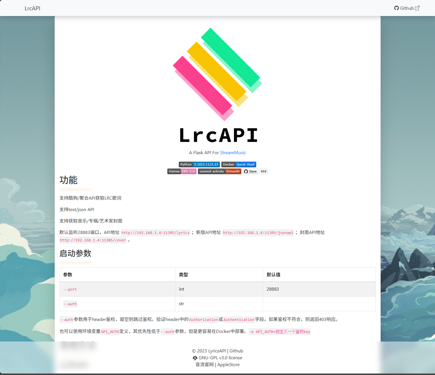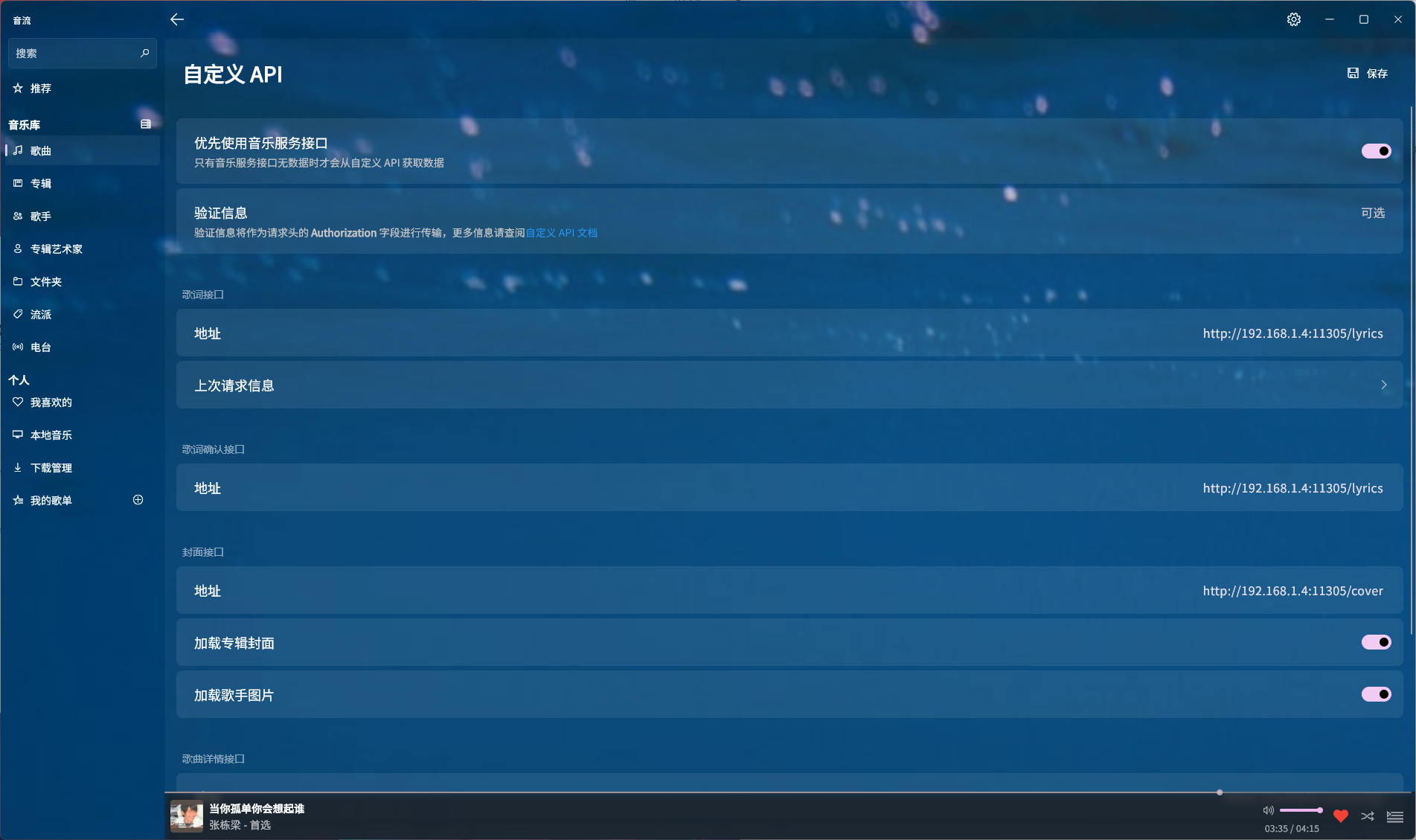 知乎一个教程不错:https://zhuanlan.zhihu.com/p/1922351102130642963 ## Navidrome NAS上直接使用插件,或者docker安装都可以。 ## 刮削软件musictag 直接拉取docker镜像 镜像:xhongc/music_tag_web:latest [github](https://github.com/xhongc/music-tag-web)   只改了网络端口和存储位置即可,其他默认:  后台:http://172.22.25.191:8112/admin 登录 admin+lai09(默认是admin) 前端:http://172.22.25.191:8112 【打开很慢,可能开启后就在刮削了,里面有5k+首歌曲】   进一步选择批量操作的设置。个人建议考虑选择“宽松模式”,刮削的成功率会高一些,就算有刮削错误的我们后期也可以修改。至于音乐源可以直接全选。  ## 音流 设置自定义API,将可以让歌曲播放的时候,自动去获取歌词和封面。 ### Docker安装lyricapi镜像    开启后,即可访问: http://192.168.1.4:11305/src  然后将API填入到音流APP中: