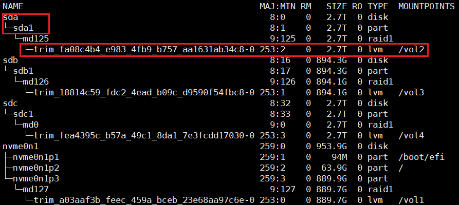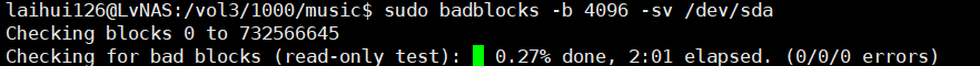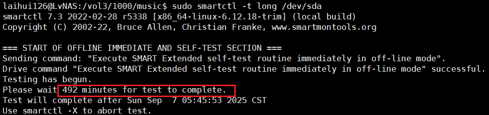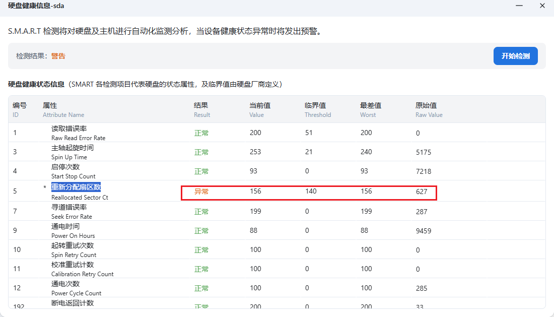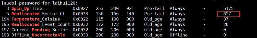 飞牛提示硬盘检测异常  这儿原始值看到627,原本应该是0,所以应该是有627个坏道。 ## Linux系统进行检测 ```shell # 安装工具 sudo apt install smartmontools # Debian/Ubuntu sudo yum install smartmontools # RHEL/CentOS # 查看盘 lsblk ```  ```shell # 扫全盘,只看关键指标 sudo smartctl -a /dev/sda1 | grep -E 'Reallocated|Pending|Uncorrectable|Spin_Up|Temperature' ```  解读 - Reallocated_Sector_Ct > 0 → 已有 627 个坏区被重映射,不可逆。 - Current_Pending_Sector > 0 → 还有 37 个“待映射”的不稳定扇区,随时可能变坏。 - 值在短时间继续增加 → 盘已进入“临终期”,必须立即迁移数据。 >d 通常看到这个情况,建议赶紧迁移数据,避免数据丢失。 ## Linux下尝试修复 ```shell # 【“凑合用”方案】把剩余可用空间划新分区,避开已坏区域(需要计算 LBA 范围,复杂且高危) sudo hdparm --repair-sector 12345678 --yes-i-know-what-i-am-doing /dev/sda ``` >w 使用hdparm的时候,--repair-sector参数的值应该如何设置呢? ```shell # 从 SMART 日志里直接检查 sudo smartctl -l error /dev/sda1 ## 但是提示“No Errors Logged”,说明近期没读写错误,如近期有读写错误,会打印类似 Error 1: UNC at LBA = 0x12345678 = 305419896 ## 就把 305419896 拿来用。 # dmesg中检查: sudo dmesg | grep -i 'sector' [ 1.709216] ata4.00: 5860533168 sectors, multi 16: LBA48 NCQ (depth 32), AA [ 1.710511] ata2.00: 1875385008 sectors, multi 1: LBA48 NCQ (depth 32), AA [ 1.713876] ata1.00: 5860533168 sectors, multi 16: LBA48 NCQ (depth 32), AA ## 如果出现 blk_update_request: I/O error, dev sdc, sector 123456789 ## 就可以用123456789 # 用只读扫描把 LBA 刷出来 sudo badblocks -b 512 -sv /dev/sda ## 如果出现badblocks: Value too large for defined data type invalid end block (5860533168): must be 32-bit value ## badblocks 默认把 LBA 当成 32-bit signed 处理,最大只能到 2^31-1 ≈ 2.1 TB。你的盘是 >2 TB(实际 5860533168 个 512 B 扇区 ≈ 2.7 TB),所以直接爆表。需要改为64-bit的badblocks来 sudo badblocks -b 4096 -sv /dev/sda ```  可以用这个方法: ``` # 后台 long test,把全盘读一遍 sudo smartctl -t long /dev/sda # 过几十分钟~几小时后看结果 sudo smartctl -l selftest /dev/sda ```  >w 全盘扫描都是要等待挺久,他可以暴露出坏扇区位置。 中途也可以通过`sudo smartctl -l selftest /dev/sda`看当前扫描情况。 ## 修复注意 **注意:** - 一次只能修一个扇区;有多处坏道就重复执行。 - 该命令立即破坏该扇区原有数据,务必先做完镜像或确认数据已无用。 - 如果硬盘拒绝映射(返回 IO error ),说明备用区已耗尽,盘已报废,立刻换盘。 `sudo hdparm --repair-sector 123456789 --yes-i-know-what-i-am-doing /dev/sda`