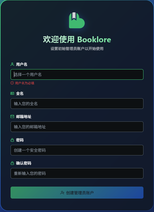 # Docker拉取booklore ## 安装 创建一个booklore目录  上传文件`.env`,内容如下: ``` # BookLore Application Settings APP_USER_ID=0 APP_GROUP_ID=0 TZ=Asia/Shanghai BOOKLORE_PORT=6060 # Database Connection (BookLore) DATABASE_URL=jdbc:mariadb://mariadb:3306/booklore DB_USER=laihui126 DB_PASSWORD=laihui0923 # 数据库密码,修改 # MariaDB Container Settings DB_USER_ID=1000 DB_GROUP_ID=1000 MYSQL_ROOT_PASSWORD=laihui0923 MYSQL_DATABASE=booklore ``` 设置`docker-compose.yml`文件,内容如下,其中`/vol1/1000/DockerApp/booklore`路径和相关密码可自行更改: ``` services: booklore: image: booklore/booklore:latest container_name: booklore environment: - USER_ID=0 # SSH输入id获得 - GROUP_ID=0 # 威联通admin默认都是0 - TZ=Asia/Shanghai - DATABASE_URL=jdbc:mariadb://mariadb:3306/booklore - DATABASE_USERNAME=booklore - DATABASE_PASSWORD=booklore - BOOKLORE_PORT=6060 depends_on: mariadb: condition: service_healthy ports: - "6060:6060" volumes: - /vol1/1000/DockerApp/booklore/data:/app/data # 可自行更改 - /vol1/1000/DockerApp/booklore/books:/books # 可自行更改 - /vol1/1000/DockerApp/booklore/bookdrop:/bookdrop # 可自行更改 restart: always healthcheck: test: wget -q -O - http://localhost:6060/api/v1/healthcheck interval: 60s retries: 5 start_period: 60s timeout: 10s mariadb: image: lscr.io/linuxserver/mariadb:11.4.5 container_name: mariadb environment: - PUID=0 # 同上面 - PGID=0 # 同上面 - TZ=Asia/Shanghai - MYSQL_ROOT_PASSWORD=meifen1028 - MYSQL_DATABASE=booklore - MYSQL_USER=booklore - MYSQL_PASSWORD=booklore volumes: - /vol1/1000/DockerApp/booklore/mariadb/config:/config # 可自行更改 restart: always healthcheck: test: [ "CMD", "mariadb-admin", "ping", "-h", "localhost" ] interval: 5s retries: 10 timeout: 5s ``` ## 使用 ### 设置管理员账户  ### 登录即可使用  # Docker拉取talebook   即可访问:http://172.22.25.191:9775 首次进入进行配置:  然后登录即可。 # 使用 ## 上传图书 回到飞牛nas文件管理里面,找到刚才创建的Talebook文件夹,在里面找到book/imports,把电子书复制到这个文件夹里面。 上传图书之后,回到服务端管理界面,左上角管理-导入图书,点击扫描书籍,然后勾选想要导入的书籍,并点击“导入书籍”按钮,就完成了。  ## 图书刮削 安装Docker talebook/douban-api-rs 刮削:    # 手机版 ## IOS使用 Kybook2 安卓使用静思阅读 添加OPDS地址(要一模一样):`172.22.25.191:9775/opds/`