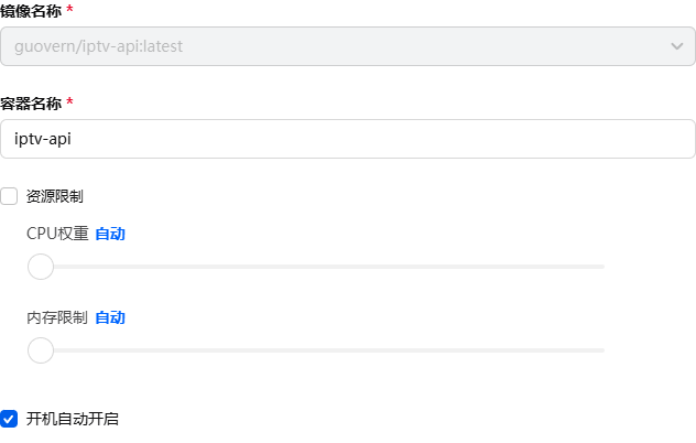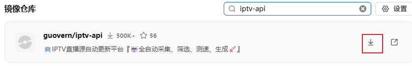 ## 安装 ### 镜像仓库中搜索iptv-api   ### 本地先创建好目录结构  ### 本地镜像中点击启动创建容器并配置     ## 配置 访问对应的地址:  地址上加上`/help`:  看到有订阅地址,把这个地址填到电视上安装的APP,如影视仓等即可使用。
